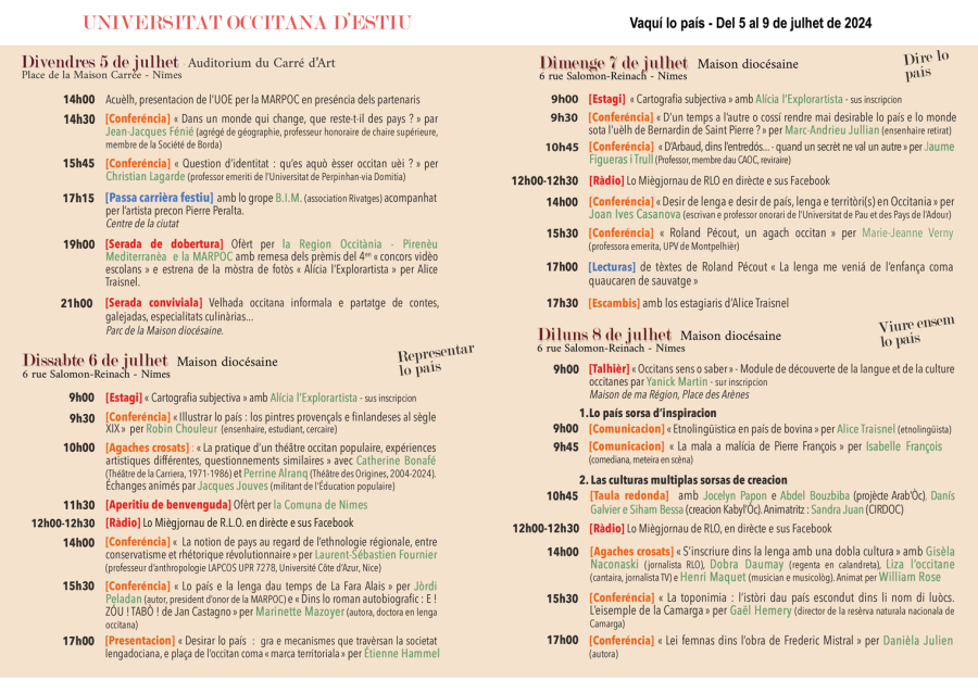 Se debanarà coma cada an al mes de julhet a Nimes, l'Universitat Occitana d'Estiu. L'eveniment, organizat per la MARPÒC, se tendrà ongan del divendres 5 al dimars 9 de julhet.