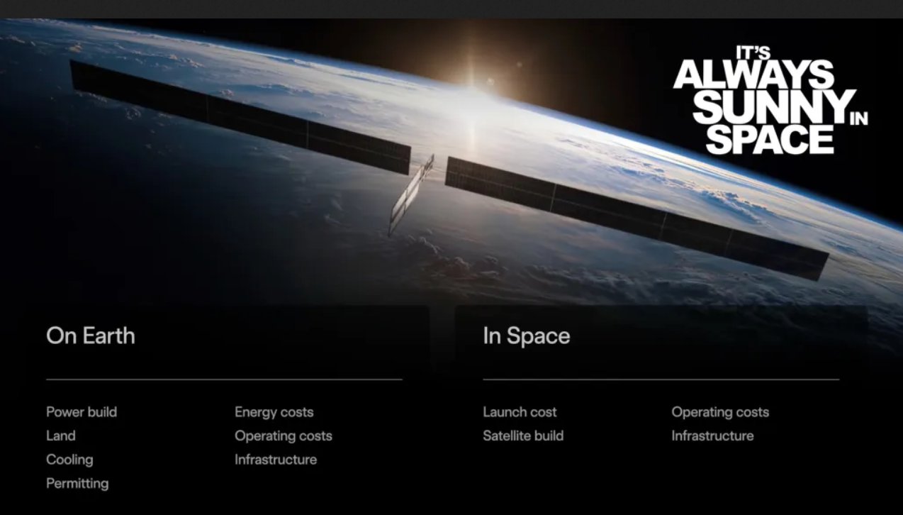 Un dels avantatge de posicionar los centres de calculs per l'IA dins l'espaci es qu'amont lo solelh lusís de contunh, çò que permet de produsir aisidament d'energia electrica.